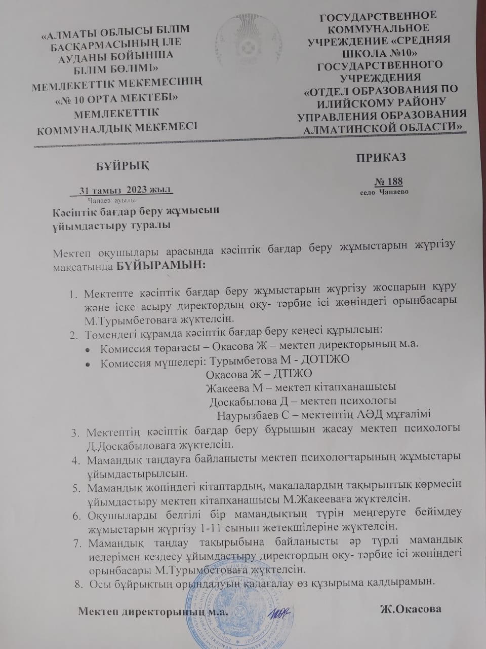 Кәсіптік бағдар беру жұмысын ұйымдастыру туралы » №10 ОРТА МЕКТЕП
