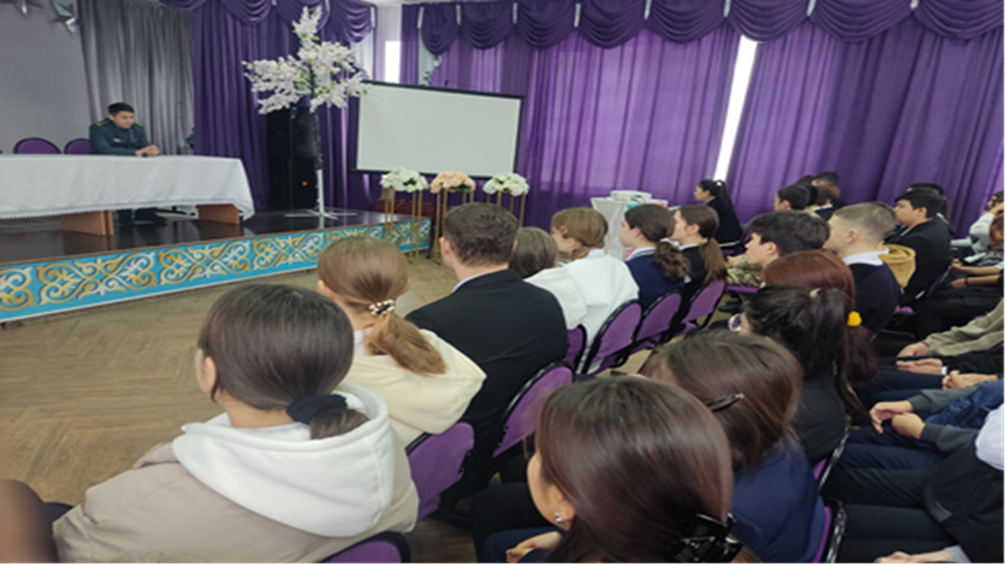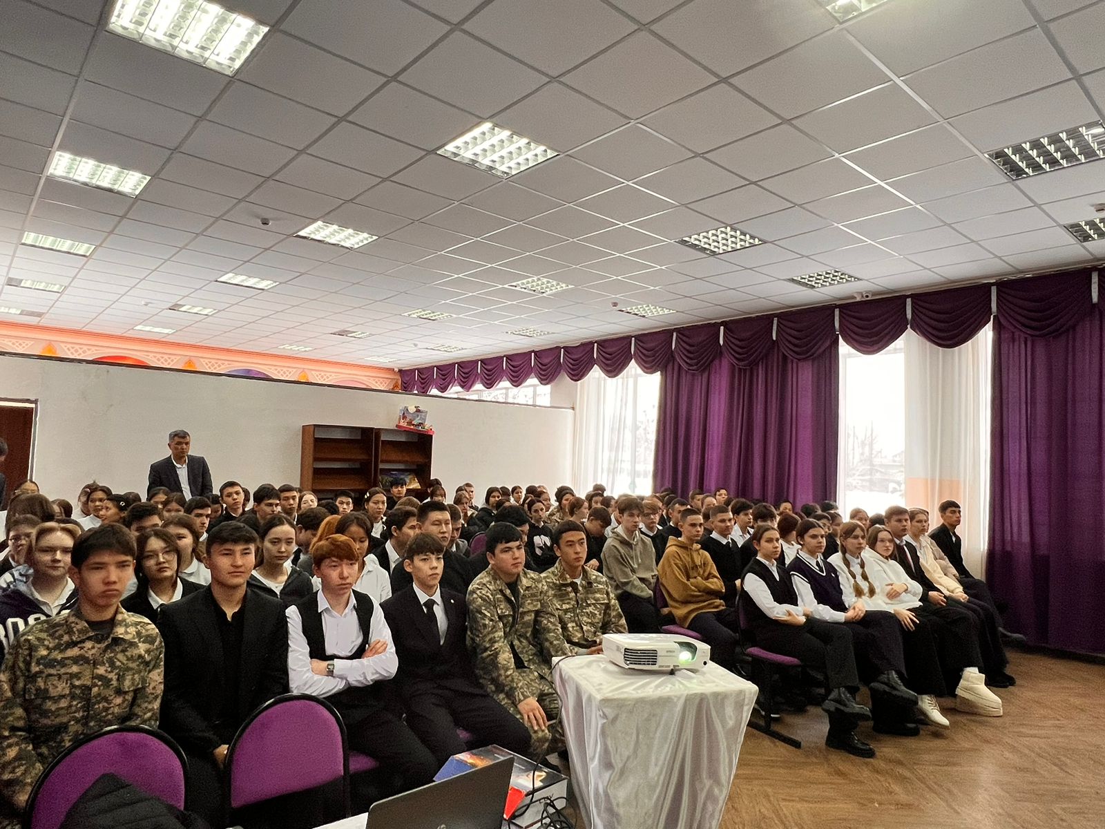 12.12.2023 оқу жылы Ұлттық қауіпсіздік комитетінің майоры Дастан Рашидовичпен 11 сынып оқушыларына кәсіби бағдар беру мақсатында кездесу өтті. Кездесу барысында Ұлттық қауіпсіздік комитеті органдары қызметінің басты міндеті еліміздің ұлттық қауіпсіздігін сенімді қамтамасыз ету екендігін атап айтып, өмір жолында арманды мақсатқа айналдыру, оны жүйелі жоспармен жүзеге асыру және орындай білу туралы да айтып өтті. Сөз соңында кәсіп иесі мамандықты жүрек қалауымен таңдауға шақыра отырып, жас жеткіншектерге сәттілік тіледі.