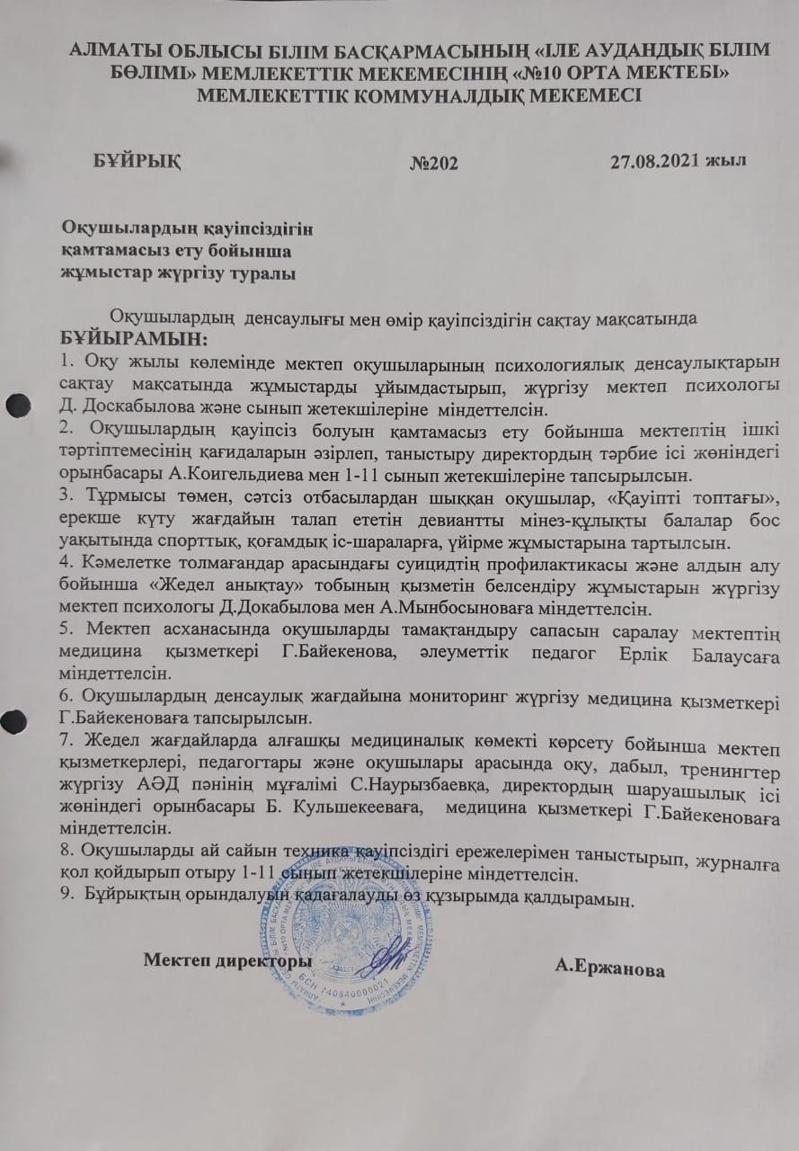 Оқушылардың қауіпсіздігін қамтамасыз ету » №10 ОРТА МЕКТЕП